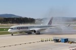 Mehr oder weniger pünktlich setzte der Airbus A350-900 mit der Registration A7-ALN in Zürich auf. Von Piste 14 rollte er in Richtung der Zuschauerterasse. Dabei wurde er gleich von einer ganzen Flotte Fahrzeugen begleitet. Unter den Augen vieler Flugzeugfans, wurde er mit dem berühmten Wasserbogen der Feuerwehr empfangen.
