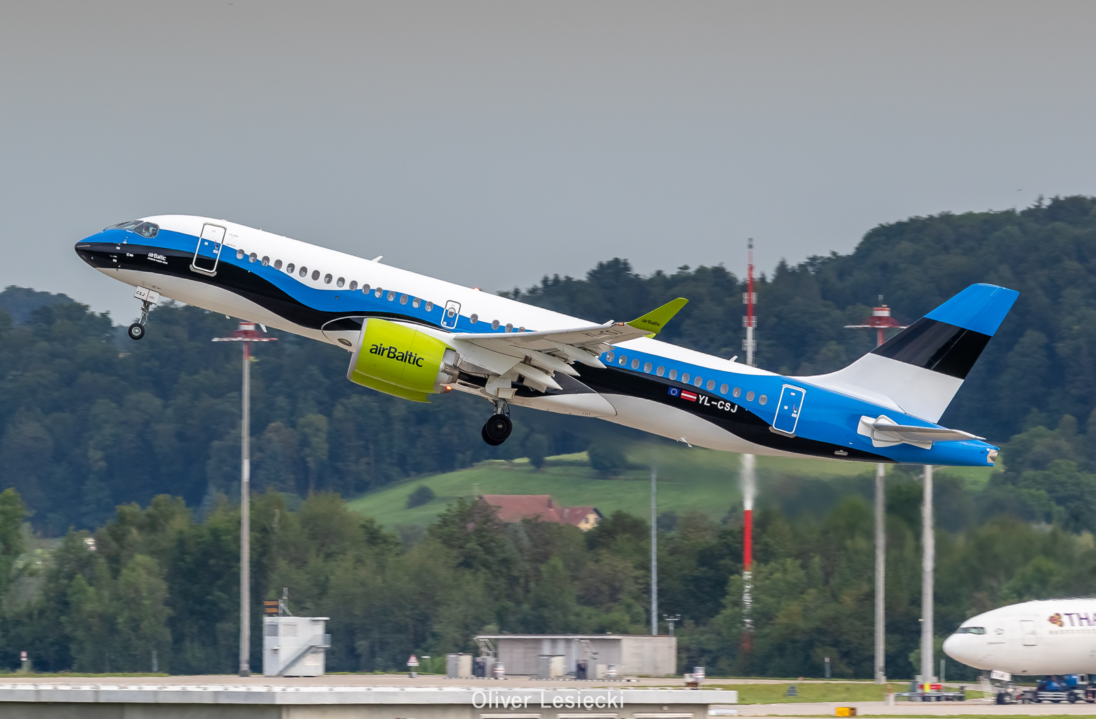 Air Baltic hat nur einen sehr kurzen Aufenthalt am Flughafen Zürich. Geplante Landung wäre 9:10 Uhr, so wie Start um 9:50 Uhr. Ich habe noch die Landung vom Sichuan A330 abgewartet und mich dann auf den Weg zum Heligrill gemacht. Von dort aus habe ich den CS300, wie ihn viele Spotter noch nennen, beim Start erwischt.
